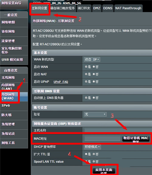 2、在设置页面中的“高级设置”区域,点击:外部网络(WAN)——>继续点击“互联网设置”——>在页面下方“来自ISP运营商的特别需求”区域,找到“MAC地址”选项,然后点击:取得计算机 MAC地址——>最后点击“应用被页面设置”。